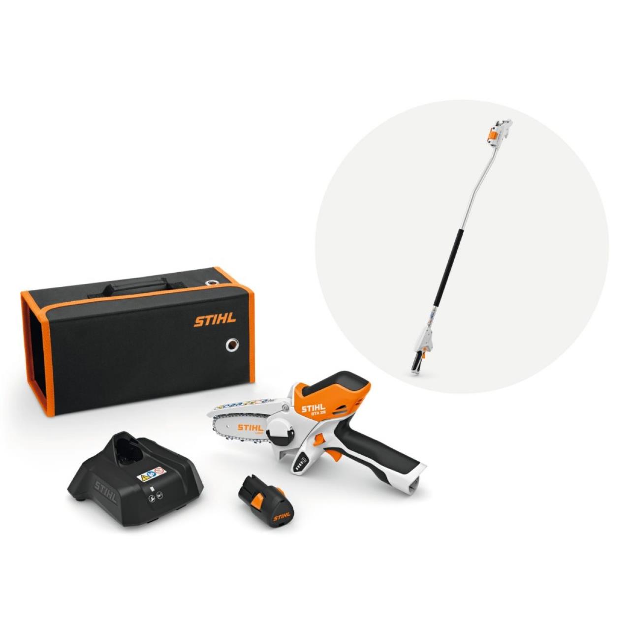 Wenn Sie noch keinen Akku aus dem STIHL AS-System und kein Ladegerät besitzen, dann lohnt es sich, den Akku-Gehölzschneider STIHL GTA 26 im Set mit einem Lithium-Ionen-Akku STIHL AS 2 und einem Standardladegerät AL 1 zu kaufen. Um Äste bequem auch an schwer erreichbaren Stellen in bis zu 3 m Höhe schneiden zu können, ist im Set zusätzlich eine Verlängerung aus leichtem, formstabilem Aluminium mit 1,5 m Länge enthalten. Den Gehölzschneider können Sie werkzeuglos in die Verlängerung einsetzen oder herausnehmen. Zudem erhalten Sie weiteres, umfangreiches STIHL Zubehör.
