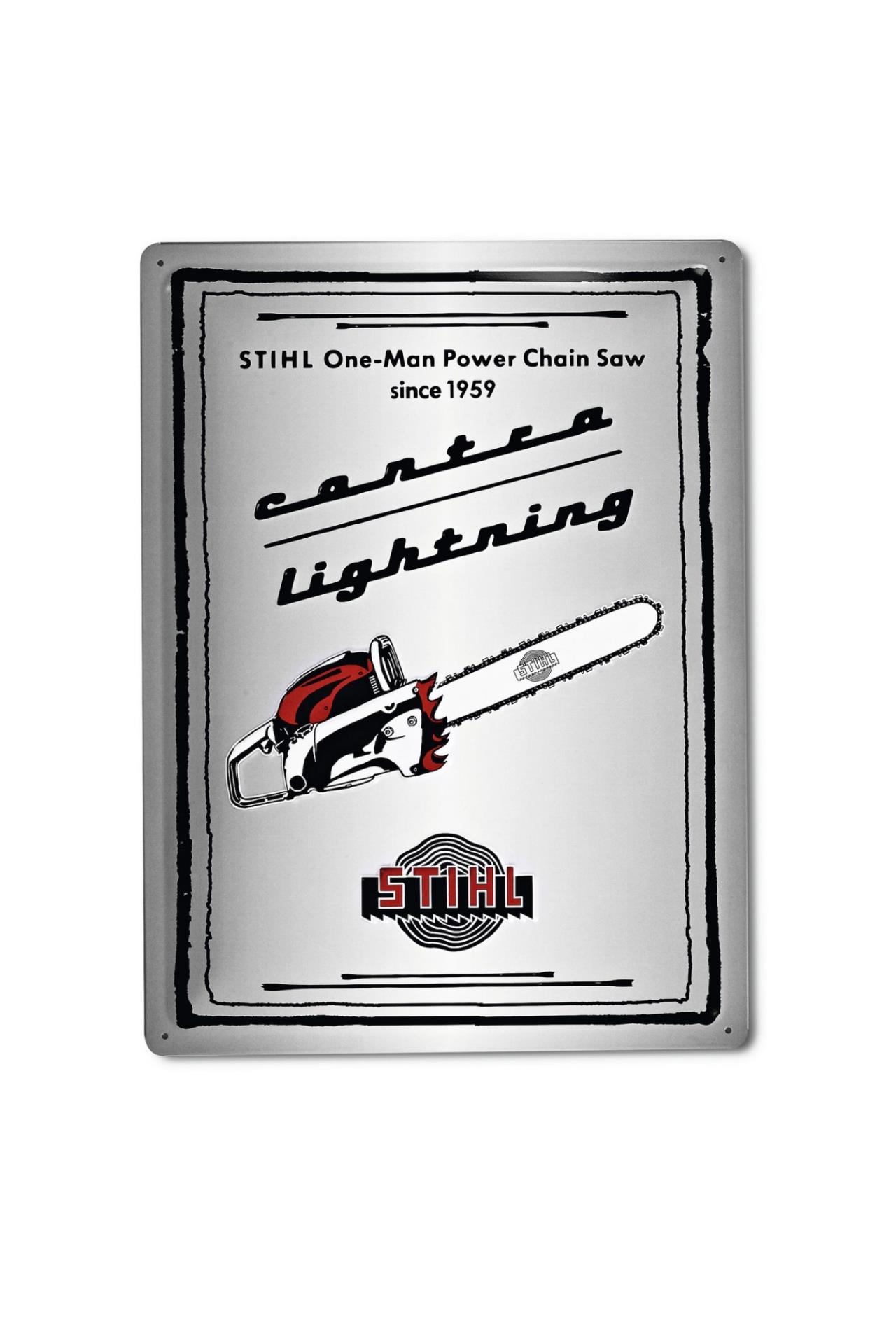 Zu ehren der ersten benzinbetriebenen Ein-Mann-Säge sollen auch unsere Sammler nicht zu kurz kommen ! Das Blechschild mit gepägtem STIHL »CONTRA« und Original-Schriftzug wird zum echten Blickfang an der Wand. Einfaches Anbringen durch vier Bohrungen. Maße: 40 x 30 cm