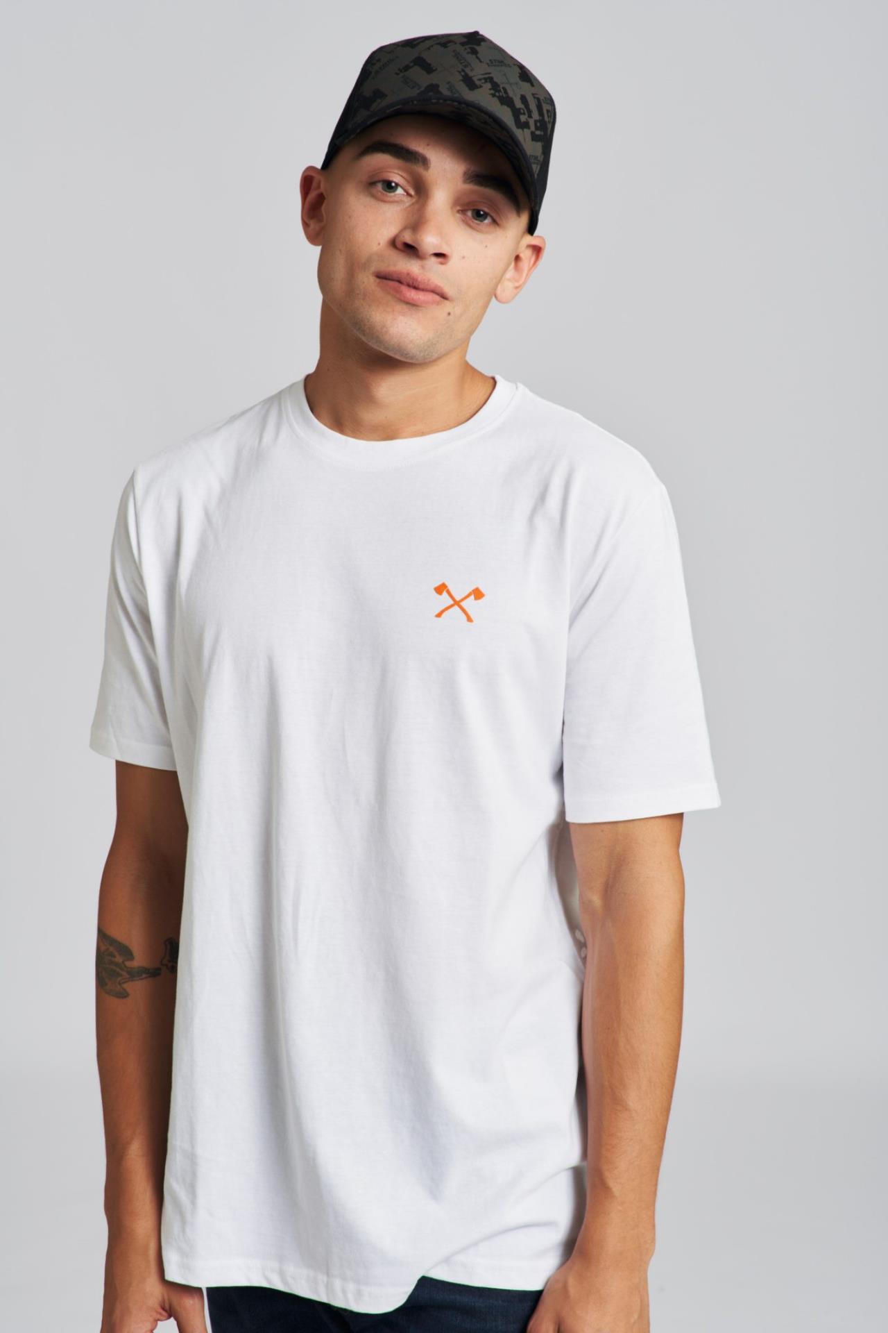Die vordere Hälfte ist mit einem Allover-Print kleiner TIMBERSPORTS® Logos, gekreuzter Äxte und stilisierten Holzsplittern überzogen. Größenverstellbar.