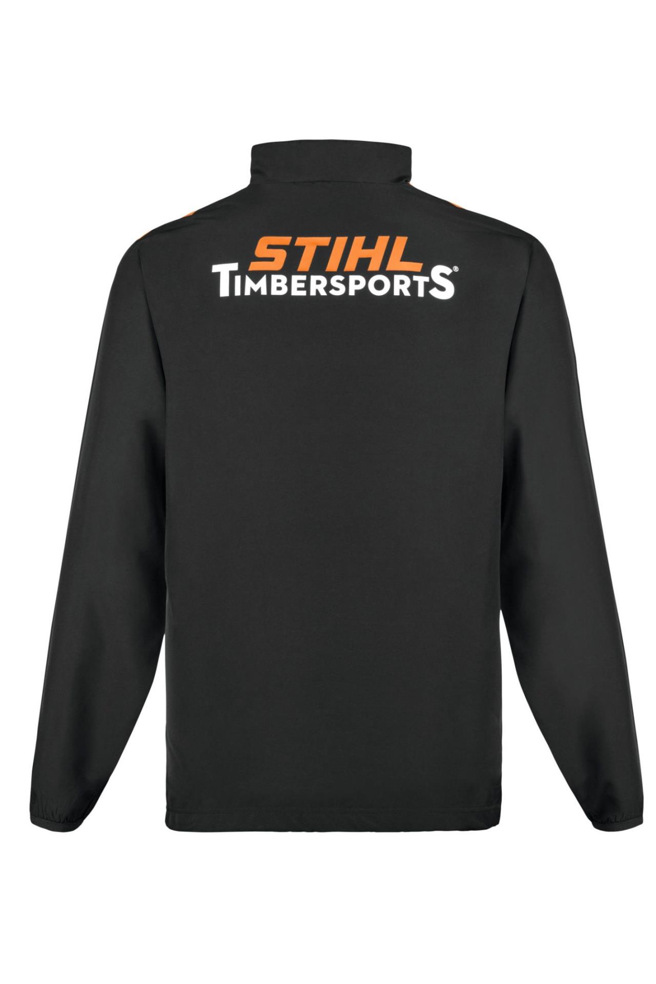 Schwarz / Orange Schlupfjacke zum 40-jährigen TIMBERSPORTS® Jubiläumim Retro-Style der 80er Jahre. Vorne auf der Brust ist das Jubiläums-Badge angebracht und der Schriftzug des Sponsors Uhlsport aufgedruckt.