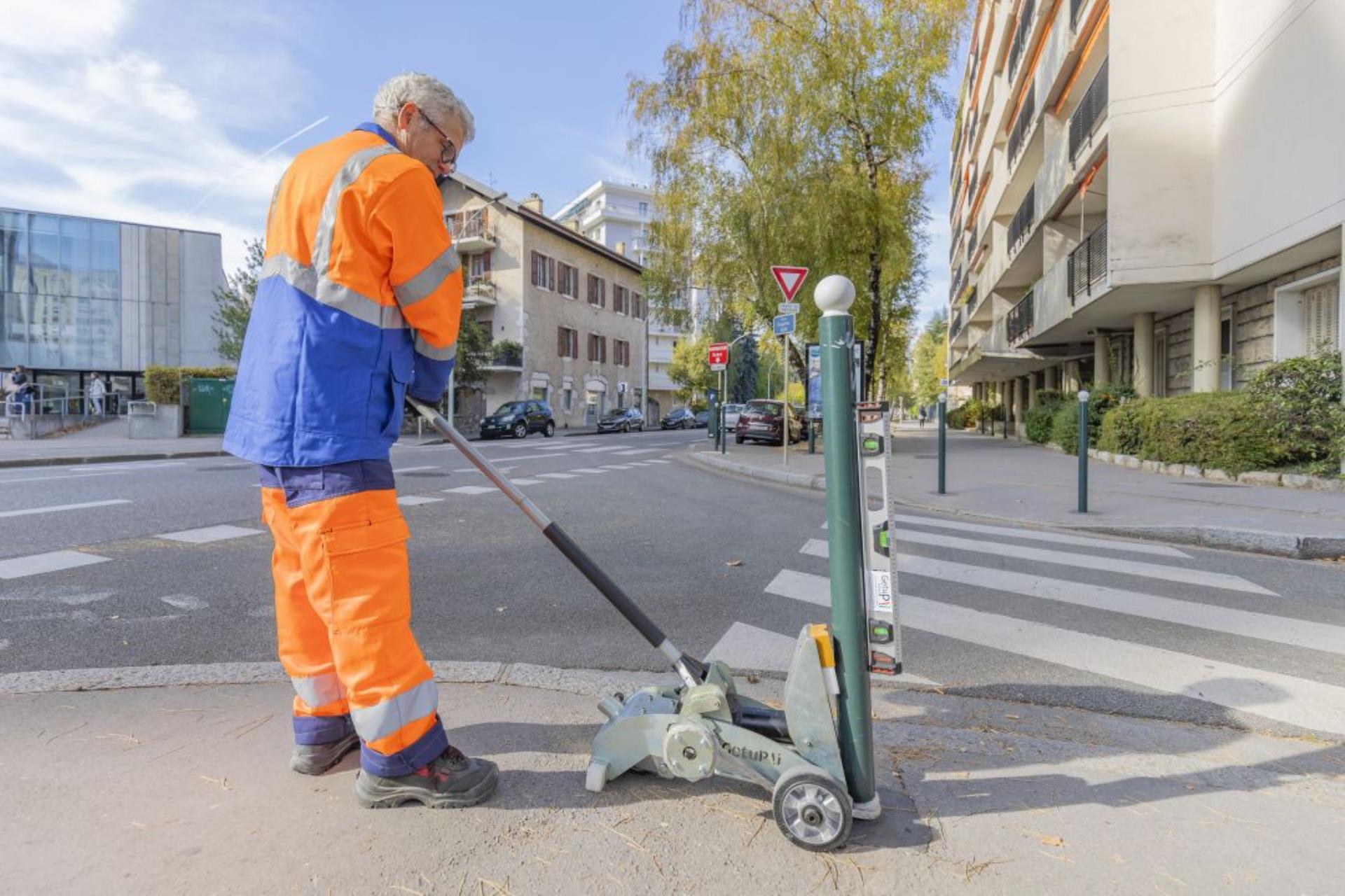 GetuP ist das ideale Werkzeug für Städte, Kommunen, Bauhöfe und Straßenmeistereien: Ein kraftvoller, horizontal wirkender Richtheber, mit dem sich verbogene Schilderpfosten oder angefahrene Poller direkt vor Ort wieder aufrichten lassen – ganz ohne Demontage.