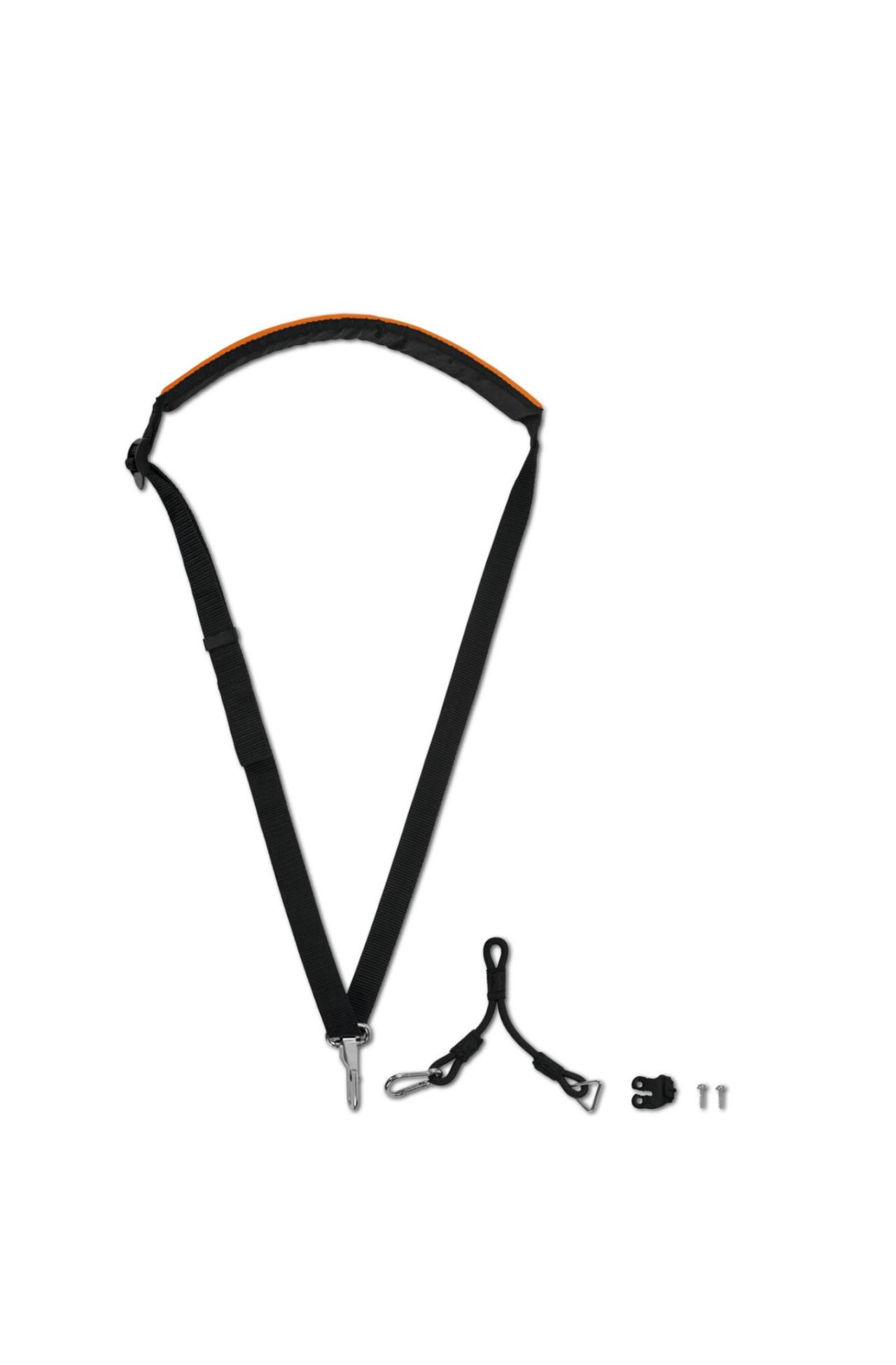 Zum Lieferumfang gehören der gepolsterte Traggurt, der Verbindungsgurt und die Befestigungsöse inklusive Schrauben.