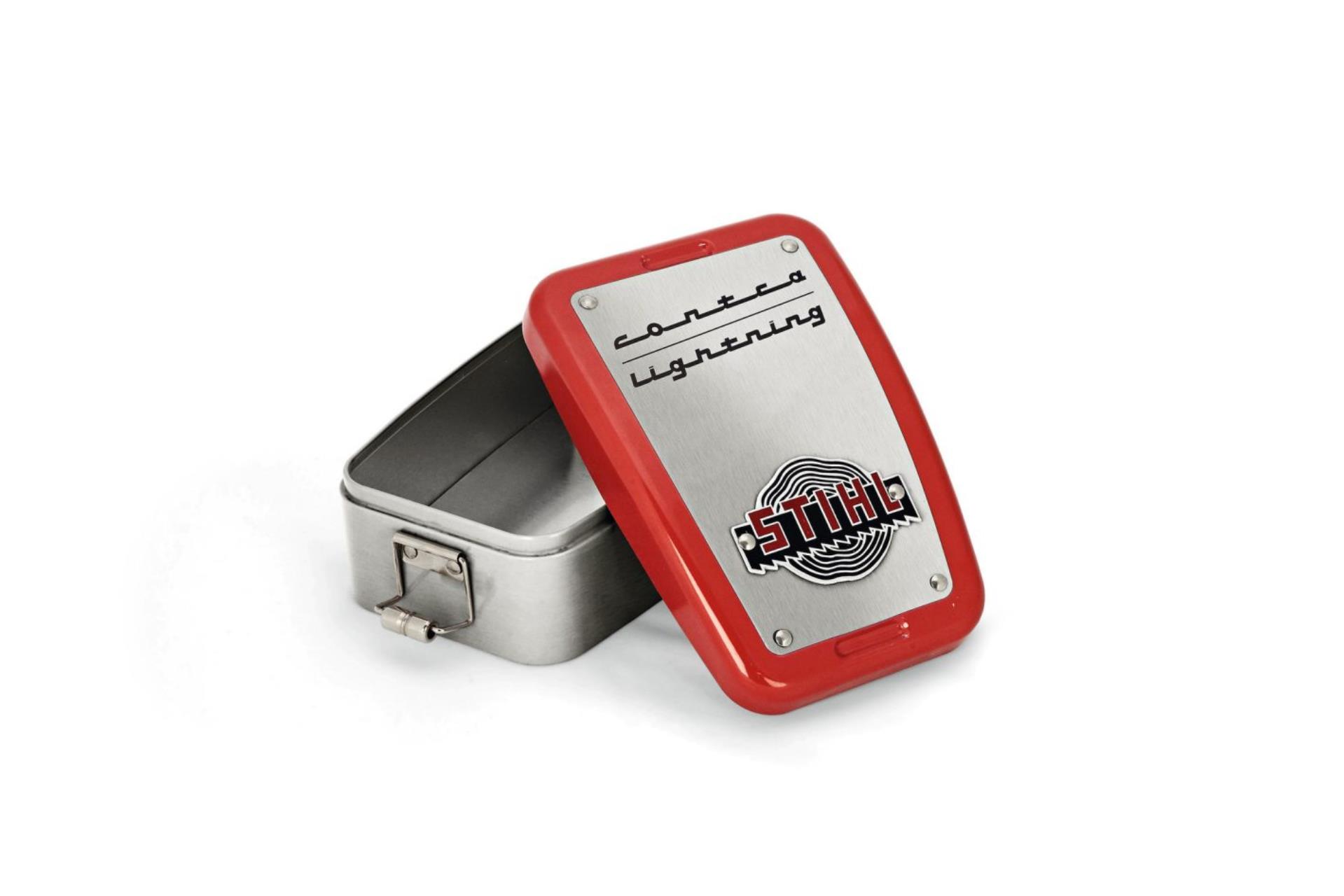 Metalldose, Größe 181 x 123 x 60 mm, mit STIHL Logo und Prägung.